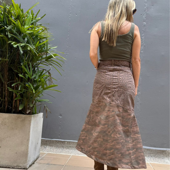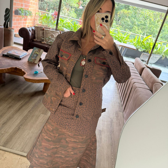 Descubre la Falda Safari, la falda midi perfecta que combina estilo bohemio con sofisticación. Esta falda animal print presenta un exclusivo estampado tipo leopardo/safari en tonos marrón y beige que destaca con elegancia, mientras que su corte slim fit realza tu silueta de manera favorecedora.